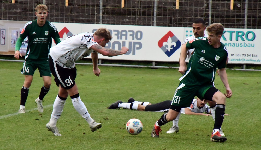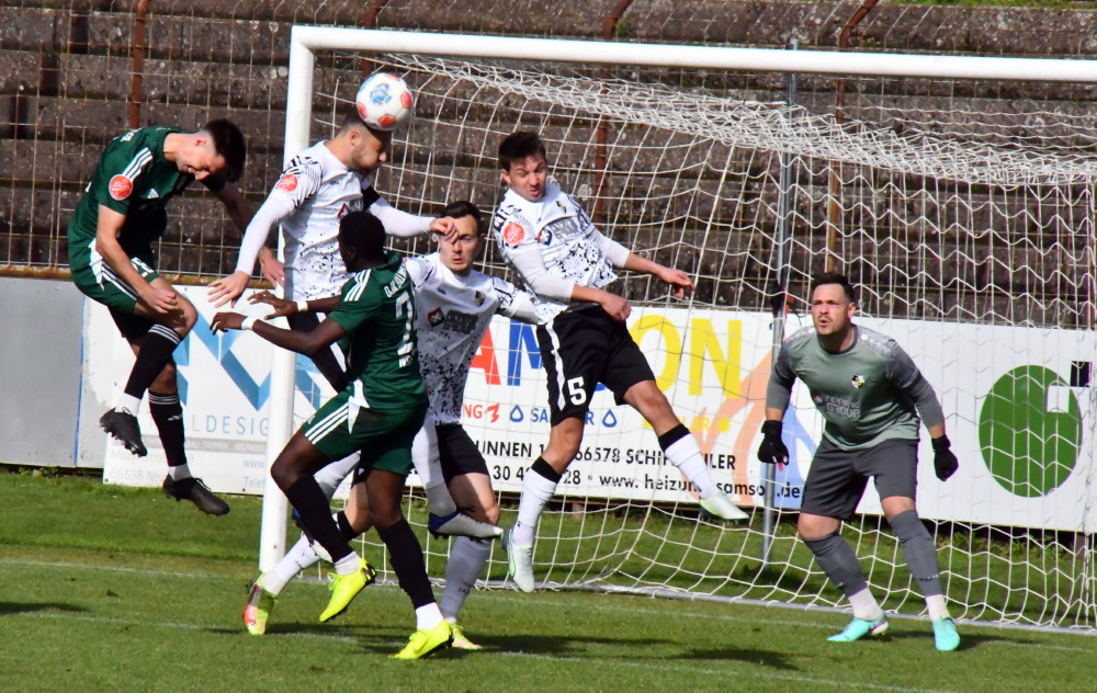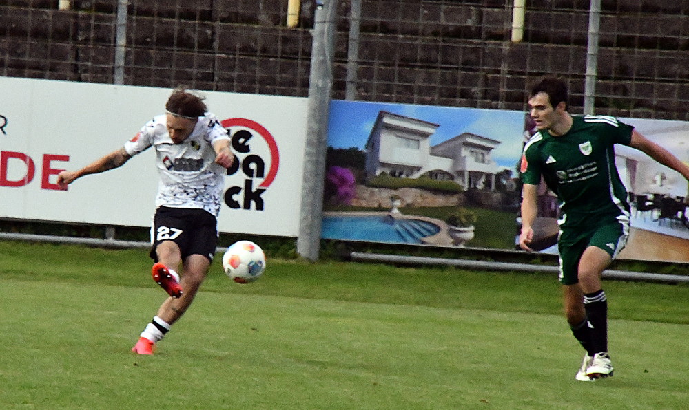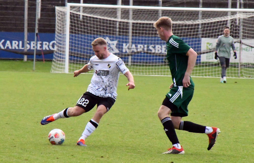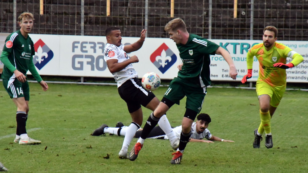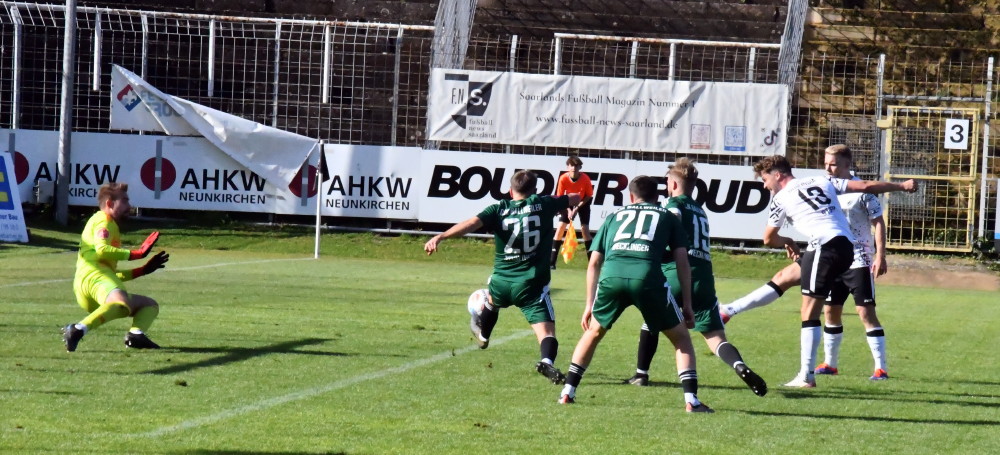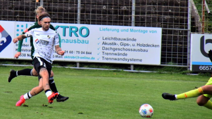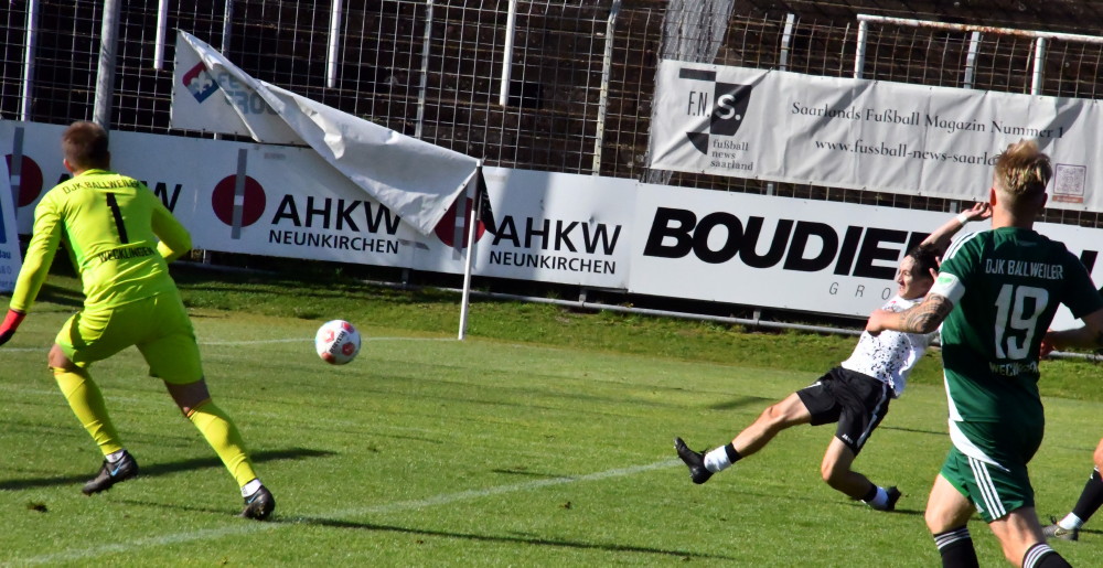 Unser Bild: Eine der letzten Aktionen von Jan Luca Rebmann – mit diesem Treffer machte Borussias Nummer 27 das halbe Dutzend gegen Ballweiler voll, musste anschließend schwer lädiert raus. (Foto: -jf-)