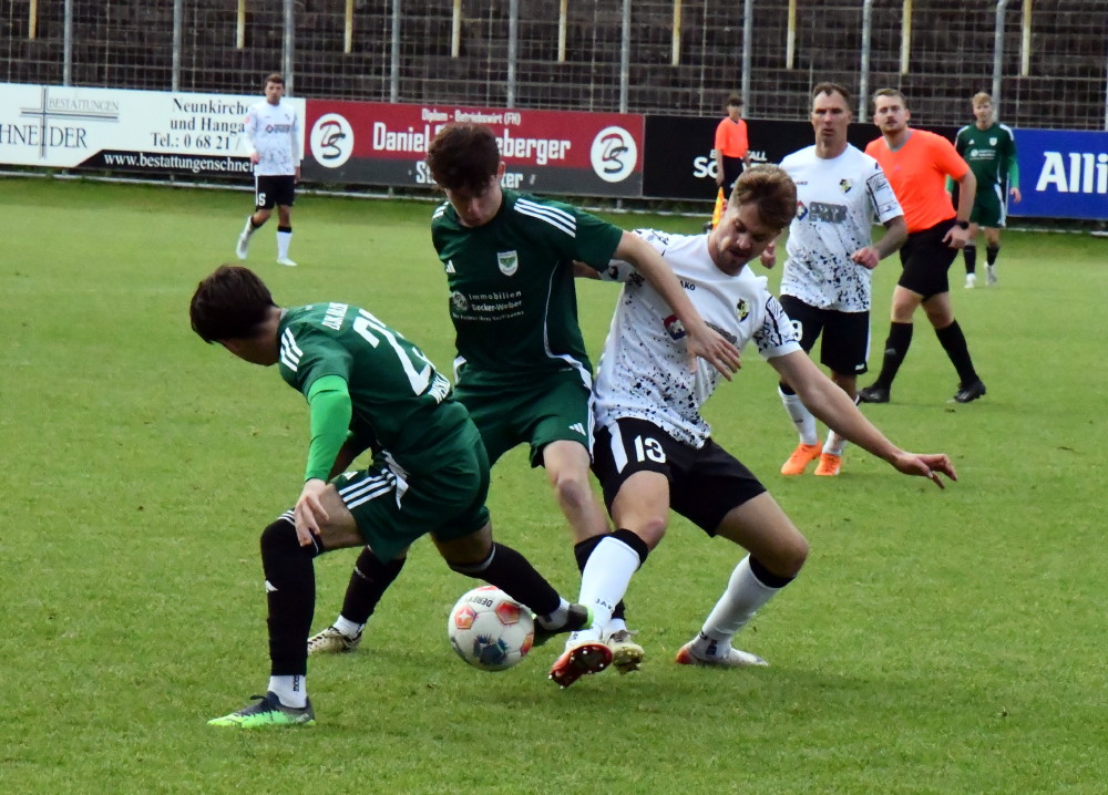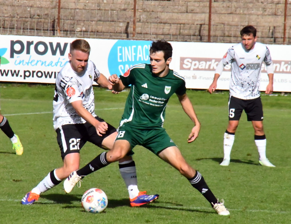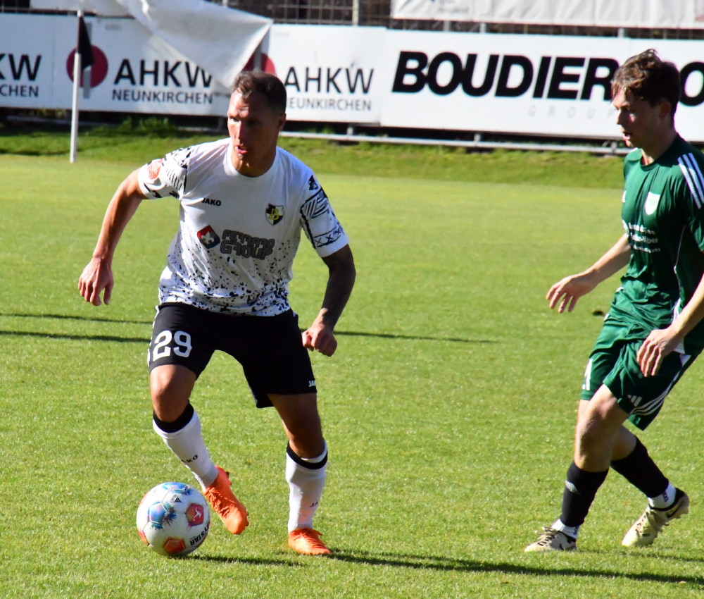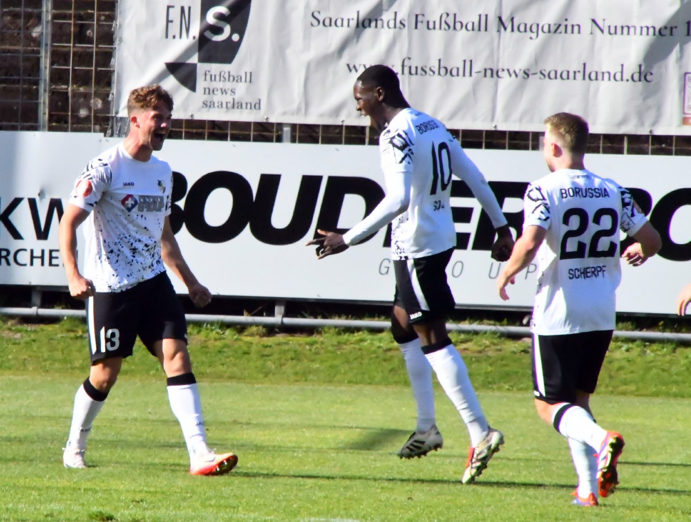 So richtig Freude wollte nicht aufkommen. Die Borussia hatte zwar gerade die DJK Ballweiler mit 6:2 geradezu aus dem Ellenfeld-Stadion gefegt, doch die Stimmung war gedrückt, kaum jemandem war nach Lachen zumute. Der Grund: Die schwere Verletzung von Jan Luca Rebmann. Der Mittelfeldspieler der Borussia, bis dahin dank zweier Torvorlagen und zweier Treffer einer der besten Spieler auf dem Feld, war nach knapp 70 Minuten im Mittelkreis ebenso brutal wie unnötig von den Beinen geholt worden. Übeltäter Piero Ortoleva, der sich nach dem an sich fairen Spiel reuig zeigte und sich ausdrücklich entschuldigte, kam mit der Zehn-Minuten-Zeitstrafe mehr als glimpflich davon. Nach minutenlanger Behandlung auf dem Platz wurde Borussias Nummer 27 mit schmerzverzerrtem Gesicht dann von seinen Mitspielern Jan Eichmann und Leon Bayer an die Seitenlinie und dann unter aufmunterndem Applaus des Publikums in die Kabine getragen, wo weitere Maßnahmen getroffen und der Abtransport ins Krankenhaus vorbereitet wurden. Die genaue Diagnose steht noch aus: Es liegt wohl kein Bruch vor, doch die Bänder dürften ab sein. Damit reiht sich Jan Luca Rebmann in die Reihe der Langzeitverletzten ein. Insofern mussten die Borussen den auch in dieser Höhe verdienten Sieg teuer bezahlen.