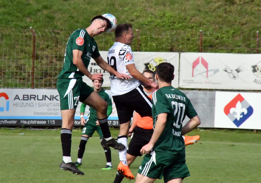 Das sorgte dann in der Pause für ein Donnerwetter in der Kabine. DJK-Coach Florian Bohr war naturgemäß mit dem Abwehr- und Zweikampfverhalten seiner Schützlinge alles andere als einverstanden. „Wehrt euch mal! Wir haben keine einzige gelbe Karte bekommen“, war hinter der verschlossenen Kabinentür deutlich zu hören. Mit Folgen: Ballweiler kam bissiger und griffiger auf den Platz zurück, hatte aber trotzdem nach knapp einer Stunde dreimal Glück, dass keine weiteren Tore fielen. Dabei erneut im Mittelpunkt: Tobias Jänicke. Borussias Offensivspieler scheiterte zunächst, von dem auf der rechten Seite mit Volldampf losmarschierten Kristof Scherpf mustergültig freigespielt, an Torhüter Cedric Kiefer (57.). Kurz darauf luchste der Ex-Profi seinem Kontrahenten im Mittelfeld der Ball ab, sah, dass Kiefer etwas zu weit vor dem Tor postiert war und riskierte einen Heber, der allerdings knapp über den Querbalken flog (60.). Davor hatte Dylan Sodji bei einem Schuss von der Strafraumgrenze in Ballweilers Torwart seinen Meister gefunden, der im letzten Moment dn Fuß ausfuhr und zur Ecke abwehren konnte (54.). Gefahr für Maximilian Strack im Borussen-Tor war nach 63 Minuten zu vermelden, doch Lukas Grünbeck brachte das Kunststück fertig, die Vorlage von Nico Bleymehl aus kürzester Distanz in die obere Etage der Spieser Kurve zu donnern (63.). Besser machte es auf der anderen Seite Jan Luca Rebmann, der binnen zwei Minuten zweimal einnetzte. Nach energischer Balleroberung von Tobias Jänicke schickte er den Ball nach abgeblockten Abschlüssen von Dominik Cullmann und Kristof Scherpf eiskalt ins Netz – 5:0 (65.), um kurz danach aus halblinker Position nach gewonnenem Zweikampf gegen Piero Ortoleva cool zu bleiben und das Leder flach ins lange Toreck zu zirkeln (67.). Das halbe Dutzend war jetzt voll.