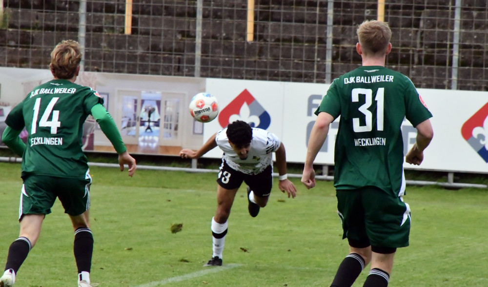Nach einem solchen flüssigen Kombinationsspiel, ausgehend von Tim Cullmann über Kristof Scherpf und Jan Luca Rebmann, landete das Leder von der linken Seite geschlagen genau auf dem Kopf des sträflich freistehenden Tobias Jänicke, der sich diese Gelegenheit nicht entgehen ließ und mit all seiner Ruhe und Routine aus kurzer Distanz per Kopf zum 2:0 einnickte (25.). Eine sehr spielfreudige Borussia hatte jetzt offenbar Appetit auf Tore bekommen. Und der wollte gestillt werden! Nur drei Minuten später stellte Dominik Cullmann das Resultat auf 3:0, als er gegen eine reichlich luftige DJK-Defensive eine Hereingabe von Jan Luca Rebmann, der auf der linken Außenbahn nicht zu halten war, aus etwa zehn Metern überlegt verwertete (28.). Und nur weitere vier Minuten später reihte sich auch Florian Stopp in den Reigen der Torschützen ein, indem er nach mehreren Abschlussversuchen – Ballweilers Abwehr hatte nach einem Eckball das Leder nicht aus der Gefahrenzone befördern können – den finalen Fangschuss setzte (32.). Anschließend ließen es die Borussen, im Gefühl des sicheren und verdienten Vorsprungs, bis zum Pausenpfiff von Schiedsrichter Torben Huss etwas ruhiger angehen, ohne allerdings defensiv in ernsthafte Schwierigkeiten zu geraten. Die Gäste, die bis dahin defensiv zeitweilig überfordert wirkten, brachten auch offensiv außer einigen Standardsituationen nicht viel zustande.