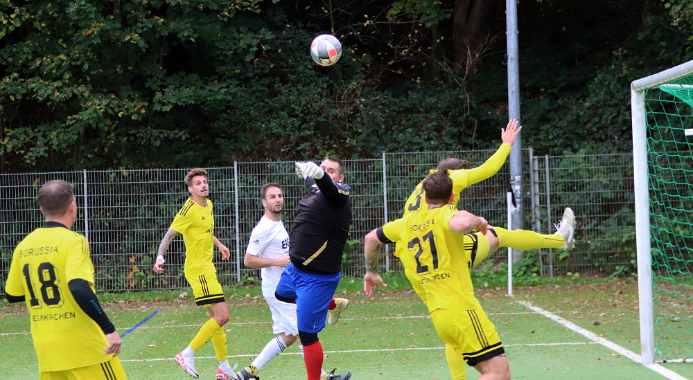 Unser Bild: Schau´n wir mal – in gespannter Erwartung eines Eckballs lauern Hangards Akteure und die Borussen auf den Ball. (Foto: Rainer Hoffmann)