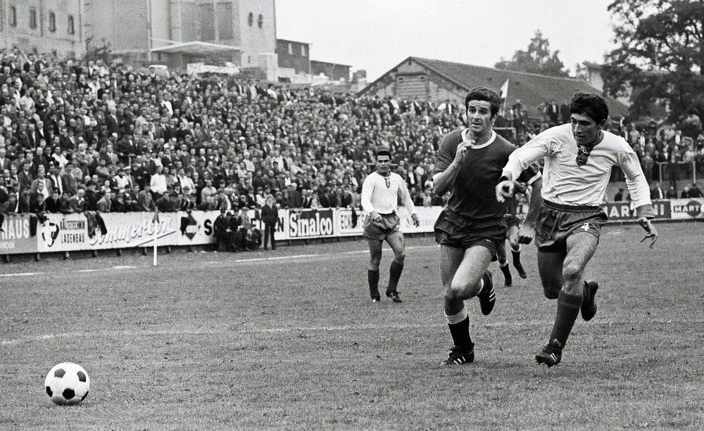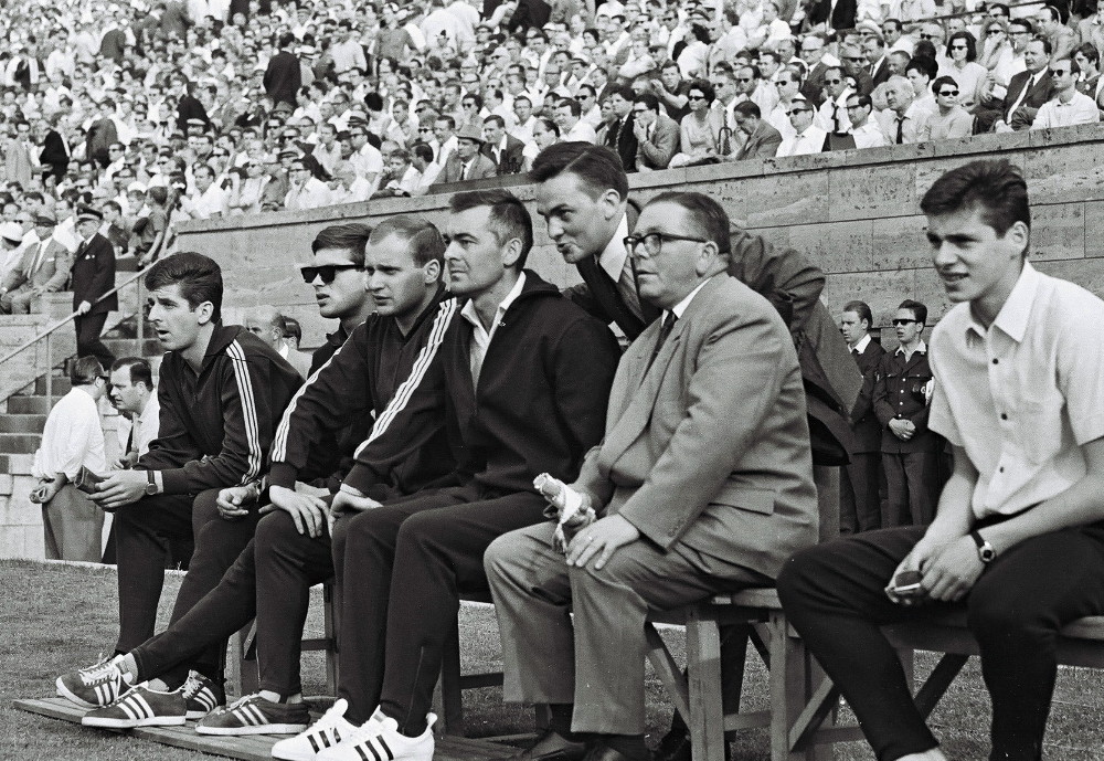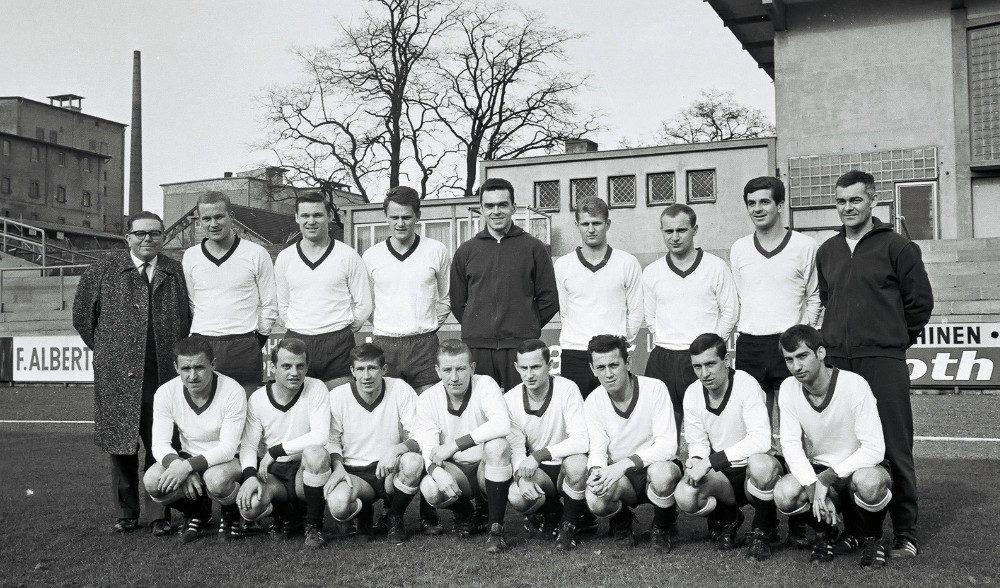 Immer im Dienst der Mannschaft: Willi Seebauer (links) fiebert beim Aufstiegsspiel der Borussia 1967 in Berlin (2:1) mit seinem Team. (Foto: 90 Minuten – mit Ferdi Hartung in die Bundesliga)