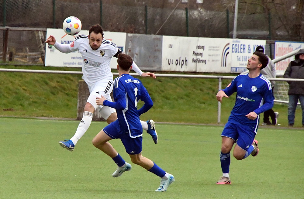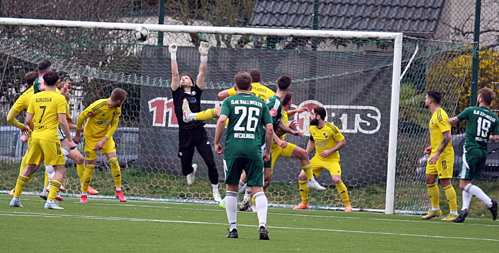 Doch die Truppe in Schwarz-Weiß zeigt eine gute Reaktion und schnappt sich eine Woche später mit 3:1 die Punkte bei der DJK Ballweiler (Foto oben/-rh-). Winterneuzugang Jannis Flausse trifft mit seinem Premierentor zum 2:0, vorher hatte Safyedine El Khadem Borussia mit 1:0 in Führung gebracht. Am Ende macht Dominik Cullmann nach Cedric Hauchs Anschusstreffer mit dem 3:1 den Deckel drauf.