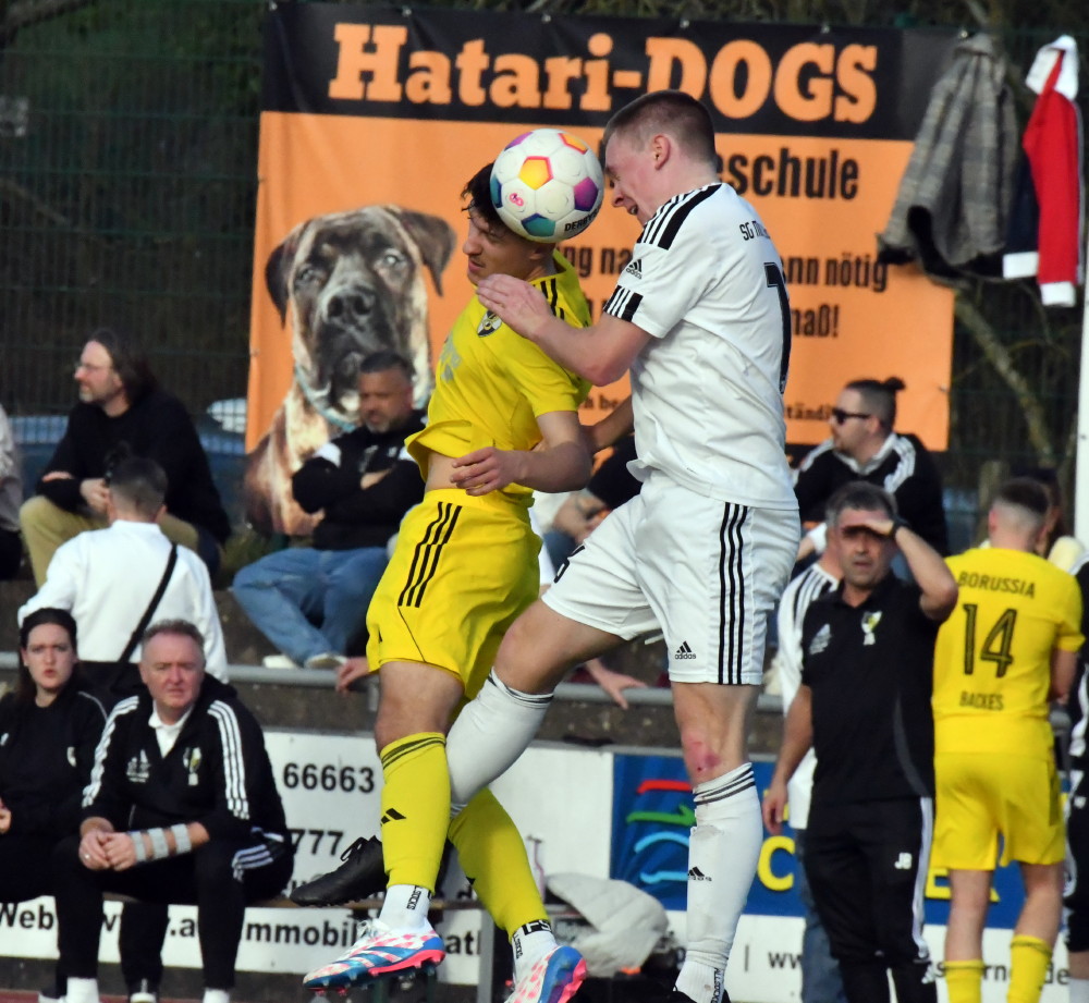 Schnappschuss am Rande des Spiels in Mettlach: „Darf ich mitspielen, bitte?“ Das tierisch gute Kopfballduell zwischen Neunkirchens Nico Christmann (li., gelbes Trikot) und Mettlachs Lukas Schaller  (Foto oben/-jf-)) macht offensichtlich Appetit auf mehr! Dem vierbeinigen Zuschauer links im Hintergrund scheint jedenfalls schon das Wasser im Mund zusammenzulaufen. Noch aber scheint er sich beim sehnsüchtigen Blick auf das runde Objekt der Begierde – wohl dank seiner disziplinarischen Ausbildung durch die Hundeschule „hatari dogs“ im saarländischen Mettlach – zurückhalten zu können!