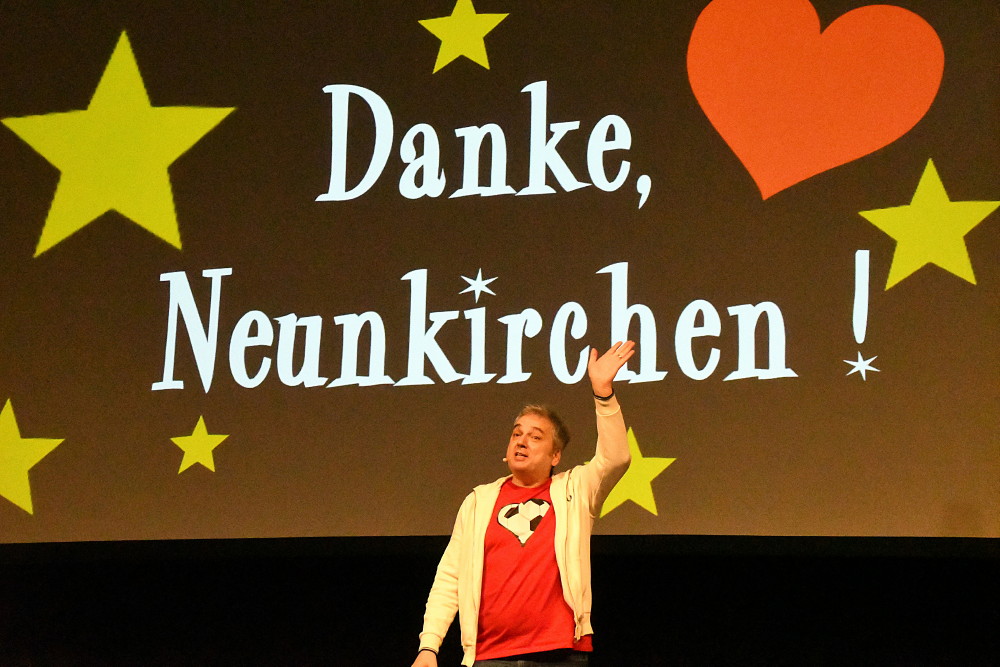 WDR-Ikone Arnd Zeigler (Foto oben/-jf-) besucht das jetzt denkmalgeschützte Ellenfeld. Der Fußball-Entertainer genießt eine fast zweistündige Stadionführung mit Borussias Ellenfeld-Experten Dr. Jens Kelm und Wolfgang Rausch und ist begeistert. So begeistert, dass er der Borussia in seinen sonntäglichen Sendungen „Wunderbare Welt des Fußballs“ gleich mehrfach ein paar Sendeminuten widmet. Abend seines Besuches absolviert er in der ausverkauften Neunkircher Gebläsehalle einen perfekt gelungenen Auftritt mit seiner Live-Show (Foto unten/-jf-) und nimmt sich anschließend noch viel Zeit für Gespräche und die Erfüllung zahlreicher Foto- und Autogrammwünsche.