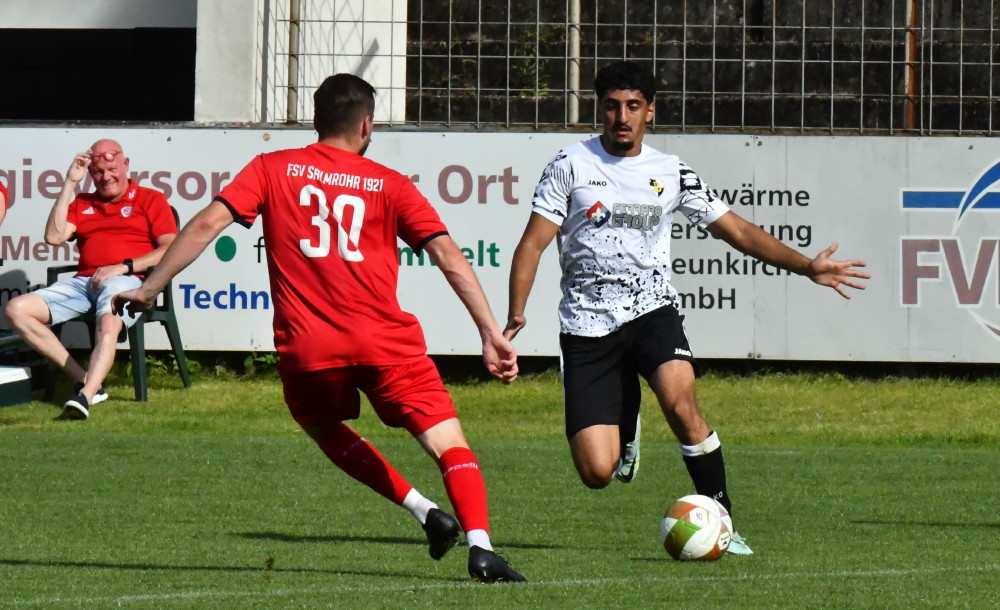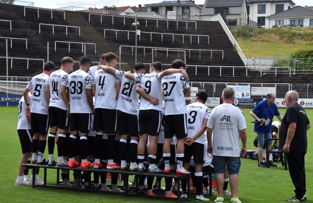 Erst Teamfoto, dann Sieg gegen Salmrohr! Die Sonne strahlt über dem Ellenfeld, als sich Mannschaft, Trainer und Betreuer zum Fotoshooting einfinden. Nachdem die Einzelbilder im Kasten sind, formiert sich die Mannschaft zum Teamfoto (Foto oben/-sw-). „Nicht, wo der einzelne steht, zählt, sondern dass wir zusammenstehen“, lautet der Slogan. Beim 4:1 gegen den mittlerweile in die Bezirksliga abgerutschten langjährigen Oberliga-Rivalen FSV Salmrohr mit Trainer Frank Thieltges bekommen die Zuschauer von ihren Borussen (mit Dilowan Günel /Foto unten,-jf-) im Ellenfeld gute Unterhaltung geboten. Tim Klein (2), Jan Luca Rebmann und Lennart Niederländer schießen die Tore.
