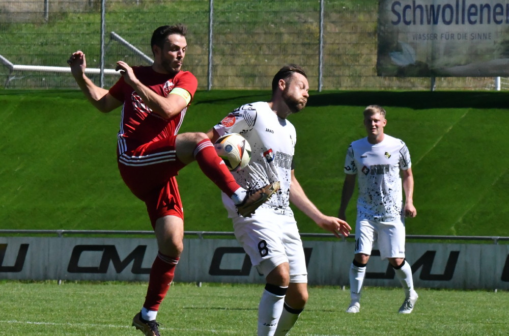 Natürlich galt es jetzt, diese Leistung im Hasborner Waldstadion zu untermauern und nachzulegen. Doch das geht gründlich daneben. Die Borussen bekommen einfach keine Konstanz in ihre Leistungskurve! Die 0:3-Niederlage gegen die Rot-Weißen und Johannes Gemmel (oben, mit Marco Dahler/Foto: -jf-) ist auch in dieser Höhe verdient. Sogar Hasborns Oldie Martin Forkel (42) darf sich kurz vor Schluss noch in die Torschützenliste eintragen.