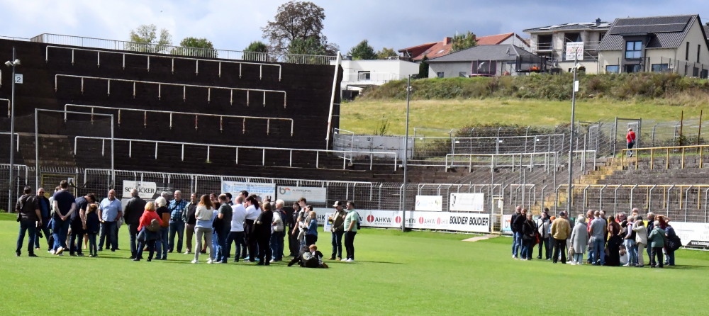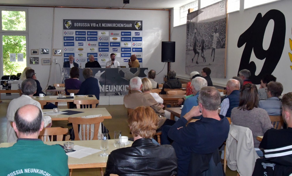 Dort hat es zwischendurch ein ganz besonderes und besonders gelungenes Ereignis gegeben. Durch den Erhalt des Denkmalschutz-Status´ war das altehrwürdige Stadion erstmals Besichtigungsort im Rahmen des „Tages des offenen Denkmals“. Der Ellenfeld-Verein e.V. und die Stadiongesellschaft (SGE) hatte keine Kosten und Mühen gescheut, ein buntes und attraktives Angebotspaket zu schnüren, das von den Besuchern begeistert angenommen wurde. Stündliche Stadionführungen (Foto oben/-jf-), Ausstellungen diverser Memorabilien aus 120 Jahren Geschichte der Borussia, ein Platzkonzert der Bigband der saarländischen Polizei, Kabinenkino mit Borussia-Filmen nonstop sowie Nicky Kassners Talkshow mit Ehrenpräsident Dr. Hans Bauer (Foto unten/-jf-), Ex-Spieler Jupp Henkes sowie Borussen-Archivar und Buchautor Tobias Fuchs fanden enormen Anklang. Am Ende waren es über 1.500 Besucher, die den Tag über verteilt dem Stadion die gebührende Ehre verliehen. Die Bilanz des Ellenfeld-Vereins fiel sehr positiv aus: „Mit so viel hatten wir nicht gerechnet! Das macht Appetit auf mehr und gibt uns Mut, auch im nächsten Jahr beim Tag des offenen Denkmals wieder an den Start zu gehen.“