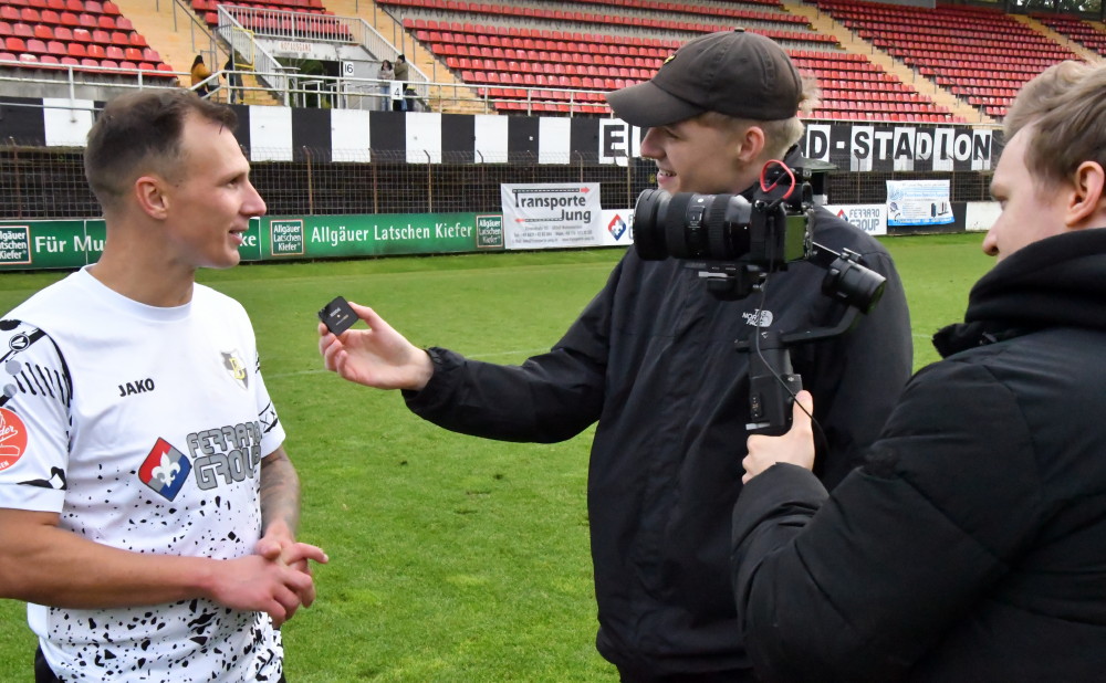 Auch sportlich ist im Ellenfeld Ende September nach drei sieglosen Spielen wieder Land in Sicht: Die Borussen (mit Tim Cullmann/Foto oben: -jf-)schießen sich gegen die DJK Ballweiler mit 6:2 den angestauten Frust von der Seele. Tobias Jänicke eröffnet mit zwei Treffern den Torreigen, Dominik Cullmann, Florian Stopp und Jan Luca Rebmann mit Doppelpack machen nach gut einer Stunde das halbe Dutzend voll, ehe den nie aufgebenden Gästen tatsächlich noch zwei Ehrentreffer und damit eine Ergebniskosmetik gelingt. Der Sieg wird allerdings teuer erkauft: Mit Jan Luca Rebmann wird der nächste Stammspieler (nach hartem Einsteigen seines Gegenspielers) schwer verletzt: Ausfall bis zur Winterpause! Ein Kamerateam des Saarländischen Rundfunks mit Reporter Sven Roland ist vor Ort und begleitet den zweifachen Torschützen Tobias Jänicke, der nach der Partie zum Interview gebeten wird (Foto unten/-jf-). Über ihn wird wenige Tage später im Rahmen der SR-Serie „Amateurklasse“ ein halbstündiges Porträt ausgestrahlt, in dem Tobias Jänicke Einblicke in seine lange Karriere gibt und seine Beweggründe für den Wechsel ins Ellenfeld erläutert. (-jf-) Fortsetzung folgt!