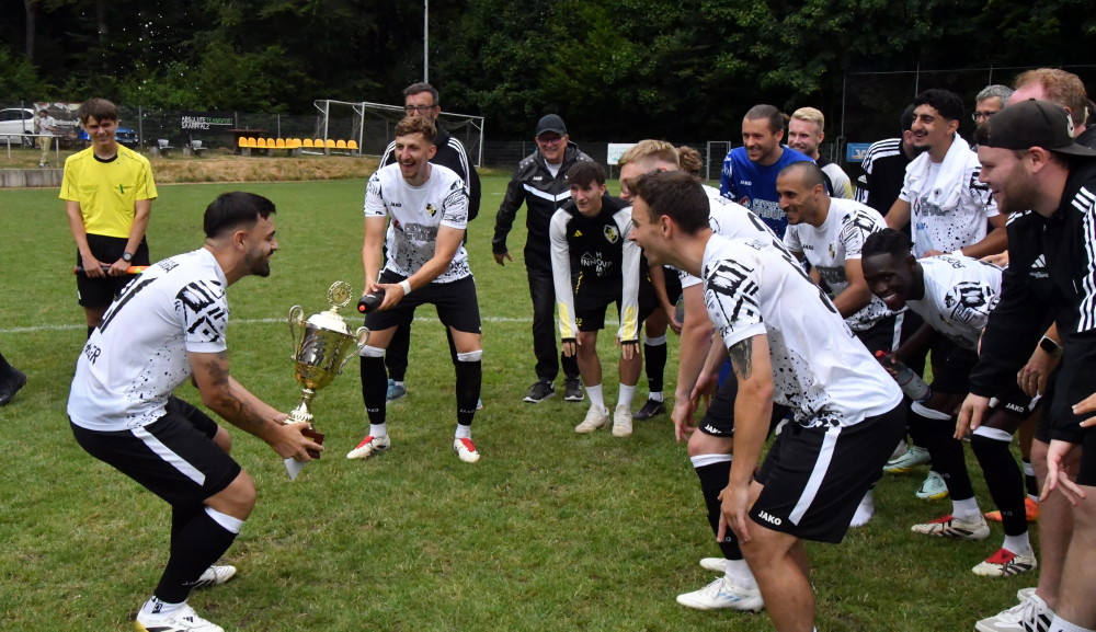 Bei den vom SC Ludwigsthal ausgerichteten Stadtmeisterschaften wird Borussia ihrer Favoritenrolle gerecht. Mit einem 6:1 über die SVGG Hangard wird das Halbfinale erreicht, in dem der SV Furpach mit 7:0 überrollt wird. Mit dem gleichen Ergebnis dominieren die Borussen im Endspiel auch den tapfer kämpfenden Gastgeber. So darf Kapitän Christoph „Stemmi“ Stemmler am Ende seinem Namen alle Ehre machen und den Siegerpokal in die Höhe „stemmen“ (Foto oben/-jf-). In den Testspielen bekommen die Schützlinge von Jan Berger und Jörg Backes nach einem 3:2 beim vom Es-Borussen Tunji Adeyemi trainierten Aufsteiger SG Marpingen-Urexweiler dann allerdings gegen den Oberligisten FK Pirmasens die Grenzen aufgezeigt: 1:6 heißt es nach 90 Minuten in der Westpfalz.
