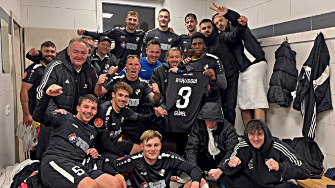 Unser Bild: Freude und Erleichterung herrschten in der Borussen-Kabine nach dem erfolgreichen Pokalauftritt beim SV Losheim. In Gedanken mit dabei: Dilowan Günel mit seinem Trikot mit der Nummer 3! Bei Borussias Abwehrspieler wurden Nierensteine festgestellt, eine sehr schmerzhafte Angelegenheit – gute Besserung! (Foto: Helena Brill)