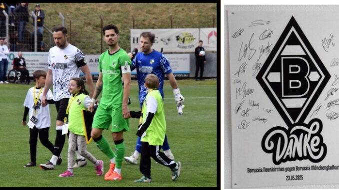 Unser Bild: Unvergesslich für Spieler, Einlaufkinder und Fans – das Freundschaftsspiel gegen Borussia Mönchengladbach im Mai 2025 (li.). Jetzt ist das Schild mit dem Gladbach-Logo und den Unterschriften der Elf vom Niederrhein aus dem Kabinentrakt spurlos verschwunden. (Fotos: -jf-)