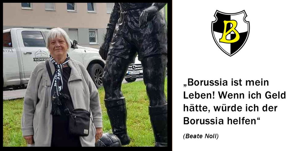 Man spürt: Die momentan ungewisse Lage hat alle mitgenommen, denen die Borussia sehr viel bedeutet und die sich ehrenamtlich im Ellenfeld engagieren. Zu ihnen gehört auch Gabi Karioth: „Es macht mir großen Spaß, in meiner Freizeit mich hier einzubringen – sei es im Verkauf von Fanartikeln oder nach den Spielen beim Getränke-Ausschank im VIP-Raum. Man trifft viele gleichgesinnte Leute, die ebenfalls große Leidenschaft für die Borussia haben. Allen voran die Tribünentruppe, mit der wir in der kurzen Zeit des Bestehens schon vieles leisten konnten und dabei viel Spaß hatten.“ Diese Tribünentruppe, auch „Ultras der Ordnung“ genannt, hat es sich seit mehreren Monaten zum Ziel gesetzt, überall, wo Not am Mann ist, anzupacken: Mäharbeiten, Aufräumen und Säubern der Verkaufsbuden, Reinigung der Schalensitze, Arbeiten am Nebenplatz in der Ferraro-Sportarena – frei nach dem Motto: „Gutes tun, der Borussia guttun und es sich danach gut gehen lassen, jeder nach seinen Fähigkeiten. Manch einer der Tribünentruppe, so zum Beispiel Gerry Klaper, ist nahezu an jedem Tag im Ellenfeld, seinem „zweiten Wohnzimmer“, anzutreffen. Warum tut man sich das an, wird manch einer fragen. Frank Nätzer hat darauf die Antwort: „Weil einfach das Herz daran hängt!“ Und Thomas Posse ergänzt: „Das ist einfach eine Lebenseinstellung.“ Auch Beate Noll (Foto unten) blutet derzeit das Herz: „Borussia ist mein Leben“, bekennt die Rentnerin, die in Sichtweite von Block 5 am Ellenfeld wohnt und nicht nur Stammgast bei den Spielen „ihrer Jungs“, sondern auch bei vielen Trainingseinheiten ist. „Wenn ich Geld hätte, würde ich es der Borussia geben“, schreibt Beate Noll und kündigt an, anlässlich der Mitgliederversammlung am 18. Dezember im VIP-Raum eine Spendenbox aufzustellen.