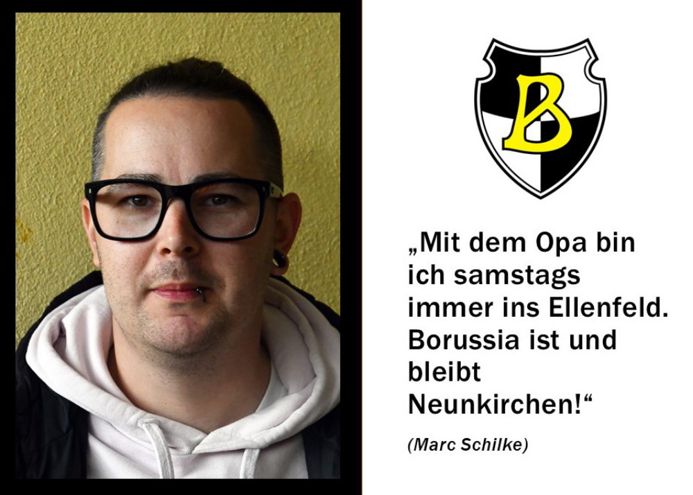 Ebenfalls groß geworden mit Borussia ist Marc Schilke: „Als kleiner Junge bin ich mit dem Opa samstags immer ins Ellenfeld! Die glorreichen Zeiten des Vereins waren mir wie so vielen in meiner Generation leider nicht vergönnt, leider hat man in den letzten 25 Jahren das langsame Sterben mitgemacht.“ Zusammen mit Mirco Reitz zeichnet Marc Schilke für das große Graffiti an der Wand zu Block 5 (Foto unten) verantwortlich, die beiden Freunde engagieren sich auch sonst immer wieder für die Borussia, so zum Beispiel am „Tag des offenen Denkmals“ im Ellenfeld. Deshalb ist es für Marc Schilke auch keine Frage, „dass wir das Bestmögliche tun wollen, um die Tradition zu bewahren, und helfen, dass Borussia in eine bessere Zukunft blickt. Das ist der Ansporn: Borussia ist und bleibt Neunkirchen und wird für immer mit dieser Stadt in Verbindung gebracht. Heimat ist dort, wo man geboren wird.“