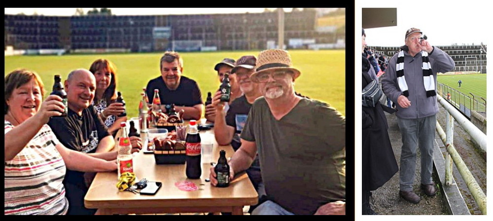 Gabi Karioth und die „Tribünentruppe“ (li.): Engagierte Helfer im Ellenfeld! Zu ihnen gehört auch Gerry Klaper (re.): Nicht nur seine kleine Fanfare ist bei jedem Spiel zu hören, sondern er ist nahezu auch jeden Tag im Ellenfeld am „werkeln“! (Fotos: privat)