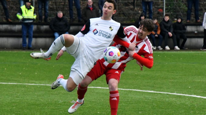 Unser Bild: „Halb zog er ihn, halb sank er hin“ – mit diesen Worten aus Johann Wolfgang Goethes Ballade „Der Fischer“ lässt sich dieser (zu)packende Zweikampf zwischen Borussias Tim Klein (li.) und Hasborns Felix Backes bestens beschreiben! (Foto: -jf-)