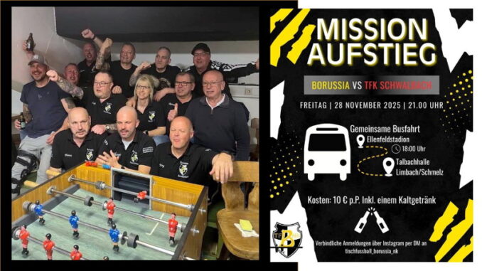 Im zweiten Jahr ihres Bestehens haben die Tischfußballer der Borussia in der Bezirksliga Südost souverän die Meisterschaft gewonnen. Sie stehen damit in den Relegationsspielen um den Aufstieg in die Verbandsliga. Dort treffen sie heute Abend in der Talbachhalle in Schmelz auf den TFK Schwalbach. Ankick ist um 21.00 Uhr. Wir drücken unseren Tischfußballern die Daumen und wünschen viel Glück und Erfolg, auf dass sie so jubeln können wie im unten stehenden Video zu sehen.