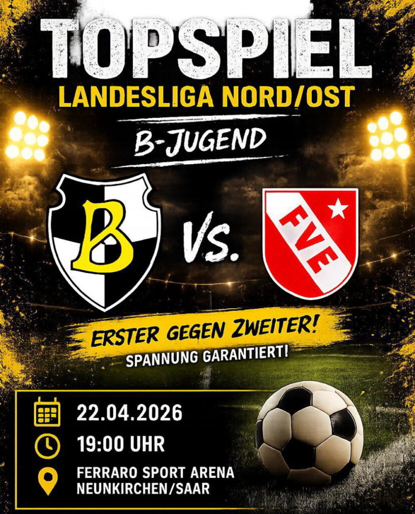 Am kommenden Mittwoch (22. April) treffen in der Ferraro-Sportarena im Ellenfeld mit den B-Jugendlichen der Borussia und des FV Eppelborn die beiden führenden Mannschaften der Landesliga aufeinander. Die Gäste sind bislang noch unbesiegt und führen die Tabelle verlustpunktfrei an – Motivation für die jungen Borussen genug, dem Rivalen die erste Niederlage beizubringen und bis auf drei Punkte an den Spitzenreiter heranzukommen. Beide Offensivreihen haben bislang in der Liga am häufigsten getroffen (jeweils 33mal), allerdings ließ Eppelborns Abwehr nur die Hälfe (7) der Gegentore der Borussia (14) zu. Die Borussen bewiesen beim 5:1 in einem Freundschaftsspiel am Sonntag bei Hellas Bildstock eine gute Form und dürfen zuversichtlich an die Aufgabe gegen Eppelborn herangehen. Über zahlreiche Zuschauerunterstützung würden sich die Jungs sehr freuen – herzliche Einladung an alle Borussen-Fans und Freunde des Jugendfußballs, am Mittwochabend ins Ellenfeld zu kommen. Der Anstoß erfolgt um 19.00 Uhr – der Jugendverkaufsraum ist geöffnet, so dass für das leibliche Wohl bestes gesorgt ist! (-jf-)