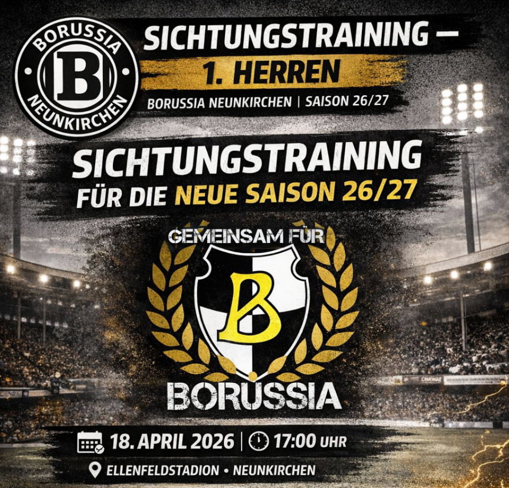 Da die erste Mannschaft der Borussia im Sommer komplett neu aufgestellt wird, findet am Samstag, dem 18. April 2026, um 17.00 Uhr im Ellenfeld-Stadion ein Sichtungstraining statt. Gesucht werden Spieler ab Landesliga-Niveau, junge Talente (aus A-Jugend und Übergang), erfahrene Spieler mit Führungsqualität sowie Spieler mit Mentalität, Wille und Leidenschaft. Geboten werden: Echte Entwicklungschancen durch Spielzeit, die Gelegenheit, den nächsten Schritt im Herrenbereich zu machen und in einem neuen Kader und einem ambitionierten Umfeld Fuß zu fassen und sich zu verbessern! Wer diese Chance nutzen und Teil des Neustarts bei der Borussia werden möchte, möge sich bitte bei Trainer Kevin Lüder melden! (-jf-)