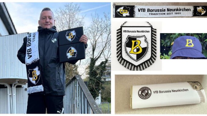 Achtung, Borussen-Fans: Anlässlich des morgigen Spiels der Borussia gegen den FV Schwalbach werden am Stadioneingang an einem Stand neben dem Geschäftsstellen-Fenster) Fan-Artikel zu reduziertem Preis angeboten. Eine Auswahl der Fan-Utensilien zeigt Markus Presser auf dem obigen Foto.