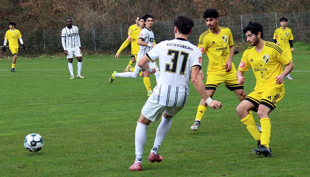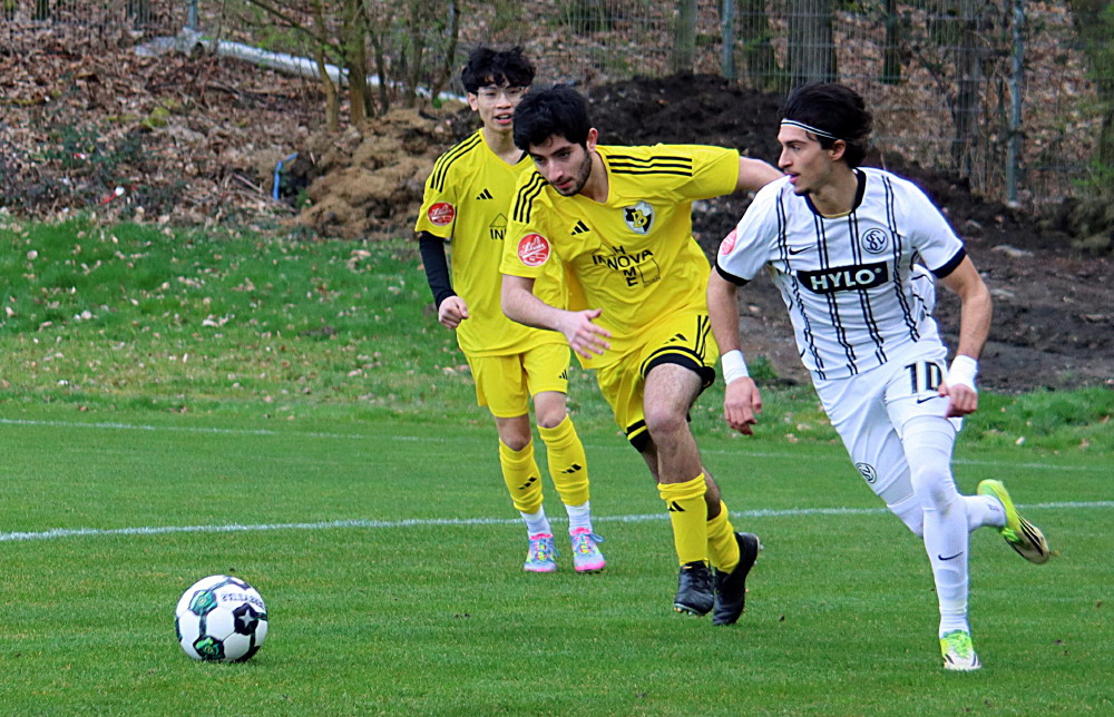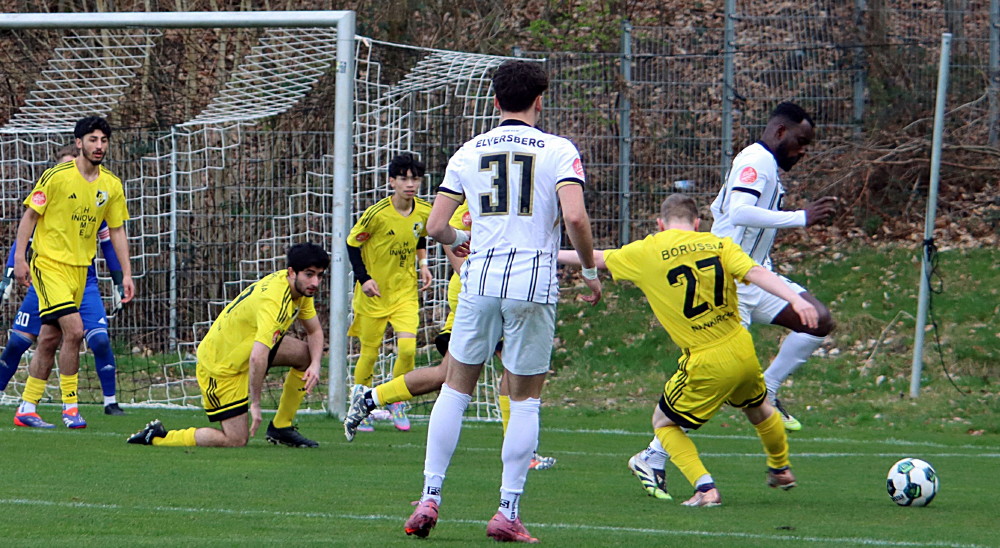 Im Unterschied zu den letzten Spielen dauerte es diesmal mehr als 10 Minuten, ehe Borussia durch Kevin Koffis verwandelten Foulelfmeter in Rückstand geriet. Der Tabellenführer war natürlich von Beginn an dominant und torhungrig als wolle sie all das nachholen, was die Zweitliga-Mannschaft von der Kaiserlinde am Freitag in Fürth (0:2) versäumt hatte. Entsprechend war Borussen-Keeper Tjorven Joel Gehre voll gefordert. Die Truppe von der Nach 16 Minuten musste er dann das zweite Mal hinter sich greifen, als Alessandro Lazzano im Strafraum einen Ball halbhoch verwertete. Weitere vier Minuten später nahm Kevin Koffi ein Zuspiel von Lionel Nottarigo auf, umkurvte den Torwart und erzielte sein 14. Saisontor, dem er noch vor der Pause Nummer 15 und 16 folgen ließ (30. / 44.). Zwischendurch hatten Lionel Nottarigo (36.) und Naserdine Touati mit seinem Premierentreffer im SVE Trikot (37.) per Doppelschlag das Ergebnis nach oben geschraubt. Die Borussen hatten in der Defensive Schwerstarbeit zu leisten und wehrten sich nach Kräften gegen die spielstarken Gastgeber, kamen erst gar nicht zu nennenswerten Offensivaktionen. Eventuelle Anregungen aus dem gemeinsam besuchten Theaterstück „Joga bonito“ am Donnerstagabend auf den Platz zu bringen, ließ der Gegner erst gar nicht zu.