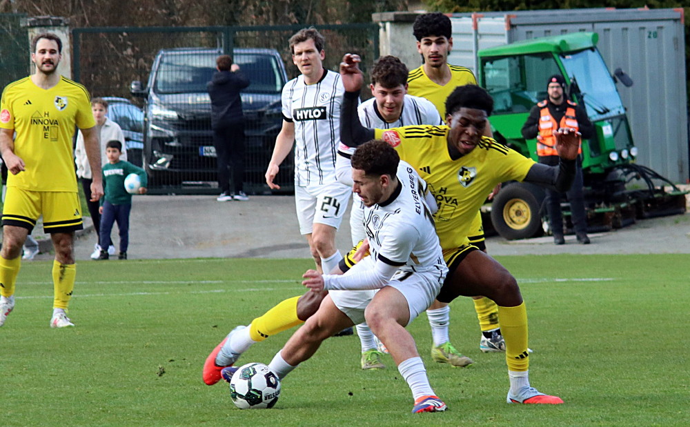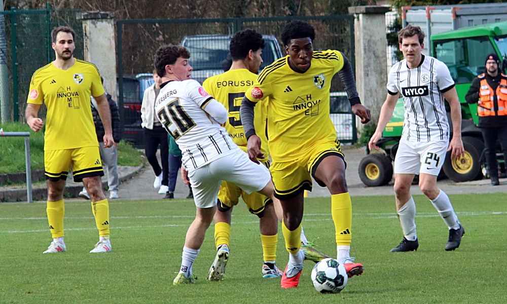 Borussias Jean-Charles Mananga Monthe im Zweikampf mit Elversbergs Anton Ziegler. Im Hintergrund beobachten Tomas Schlegel (li.) und Lukas Kohler die Szene. (Foto: -sw-/-rh-)