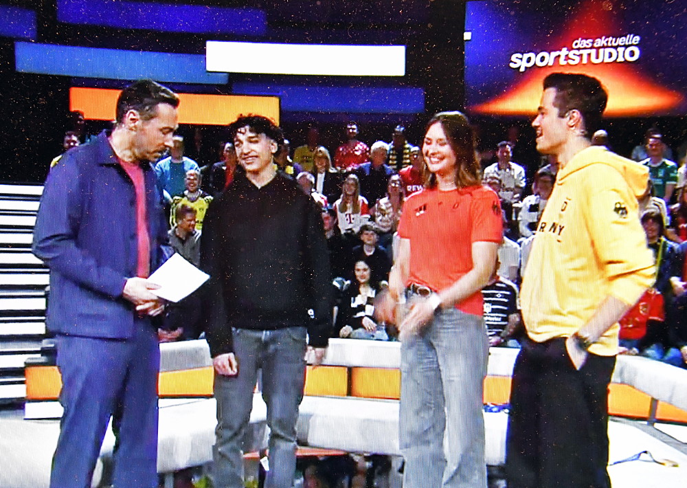 Es war ein gelungener Auftritt. Gleich der erste Schuss saß! Und es fehlte nicht viel an weiteren Treffern: Mehrfach prallte das Leder von der Kante des anvisierten Torlochs mit seinen rund 55 Zentimeter Durchmesser wieder zurück. So knapp, dass Sportstudio-Moderator Sven Voss gar den VAR im Kölner Keller bemühen wollte. Auf dem grünen Rasen würde man sagen: Vom Innenpfosten zurück ins Spielfeld statt ins Tor. Dennoch: Unser A-Jugendlicher Mahmut Ouzaid hat sich und die Borussia sowohl mit seiner sympathischen Erscheinung als auch im Wettbewerb mit den beiden Olympiasiegern Julia Taubitz (Rennrodeln) und Philipp Raimund (Skispringen) sehr gut präsentiert. Darüber hinaus hat er als Tagessieger nicht nur einen 1000,- Euro-Decathlon-Gutschein gewonnen, sondern sich auch für die am Saisonende stattfindenden Finalrunde an der Torwand qualifiziert – herzlichen Glückwunsch!