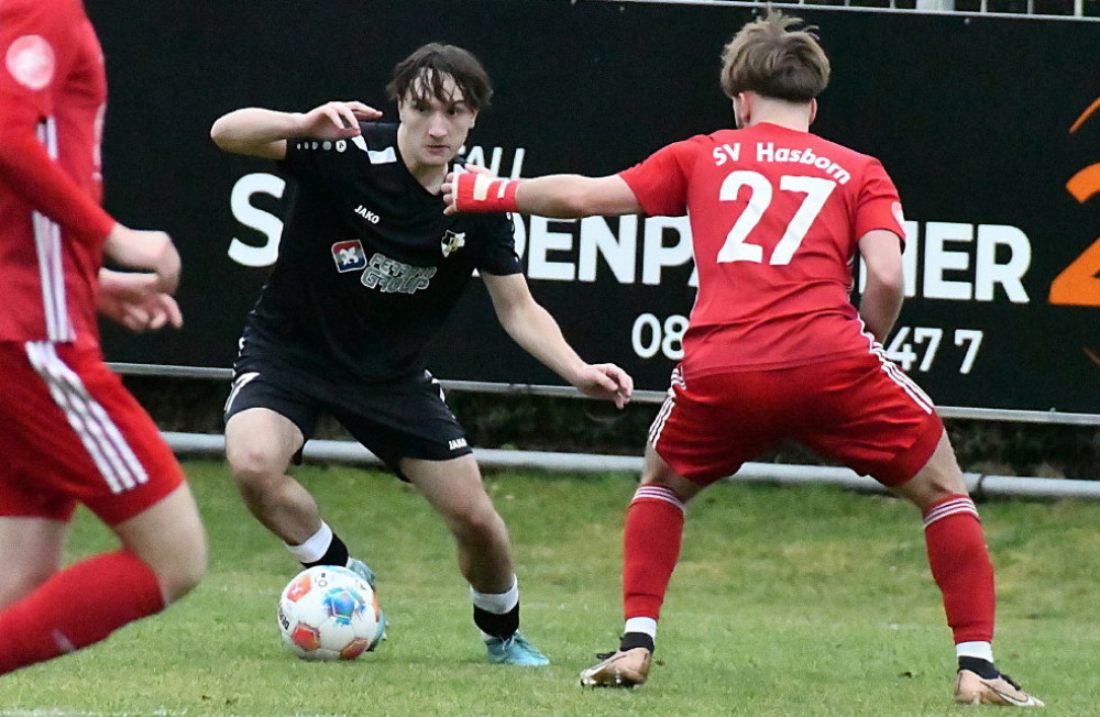 Nach Nico Christmann und Niklas Backes (beide nach Quierschied) und Dylan Sodji (zum 1. FC Saarbrücken II) verlässt auch Dominik Cullmann (oben li. mit Hasborns Gianluca Forkel, 27/Foto: -jf-) die Borussia. Wie zuvor Nico Purket wird sich der 21jährige dem Verbandsligisten FC Freisen anschließen. Für den Tabellenzweiten der Verbandsliga Nord-Ost, der zur Zeit punktgleich mit Spitzenreiter SV Schwarzenbach im Rennen um Titel und Aufstieg liegt, wird der Flügelflitzer eine enorme Verstärkung darstellen.