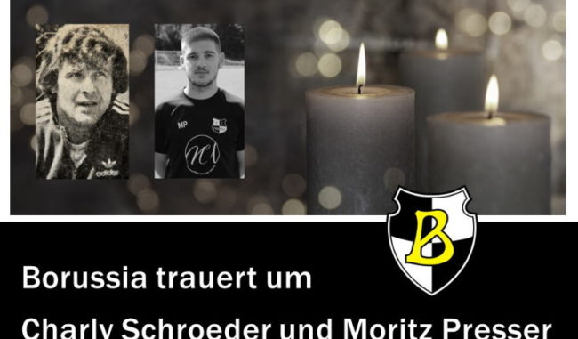 Die Borussia muss in diesen Tagen gleich doppelt den Verlust zweier lieber Sportkameraden beklagen. Am vergangenen Freitag sind die Lebenslichter des früheren Borussen-Torwart Karl-Heinz „Charly“ Schroeder und des ehemaligen Co-Trainers der U23, Moritz Presser, erloschen. Während Charly Schroeder im Alter von 79 Jahren plötzlich und unerwartet verstarb, löschte ein Autounfall das noch junge Dasein des erst 21jährigen Moritz Presser, der zuletzt für den FC Freisen kickte, aus. Alle Borussen trauern mit den Familien der Verstorbenen und übermitteln ihre herzliche Anteilnahme.