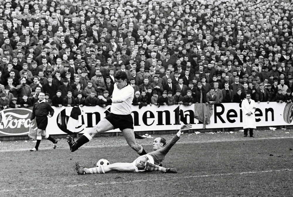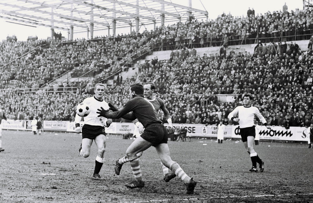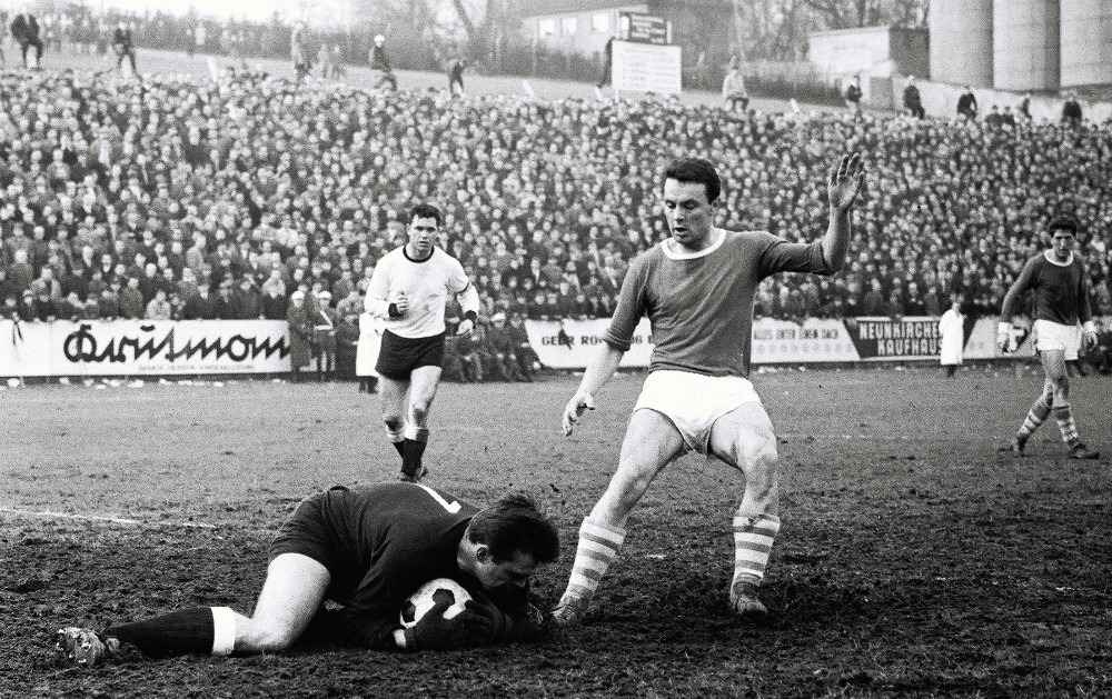 Unser Bild: Schalkes Torhüter Gyula Toth als Turm in der Schlacht – hier schnappt er sich das Leder vor Borussen-Stürmer Günter Kuntz, während im Hintergrund die Dachkonstruktion der neuen Tribüne den Baufortschritt des Ellenfeld-Stadions dokumentiert. (Foto: Ellenfeld-Verein e.V. / Archiv Borussia Neunkirchen)