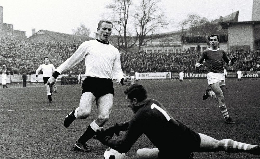 Knifflige Situation: Der bullige Günter Heiden wird im Strafraum vom Ball getrennt – elfmeterwürdig? Schiedsrichter Kurt Tschenscher aus Mannheim meint: Nein! (Foto: Ellenfeld-Verein e.V. / Archiv Borussia Neunkirchen Hartung)