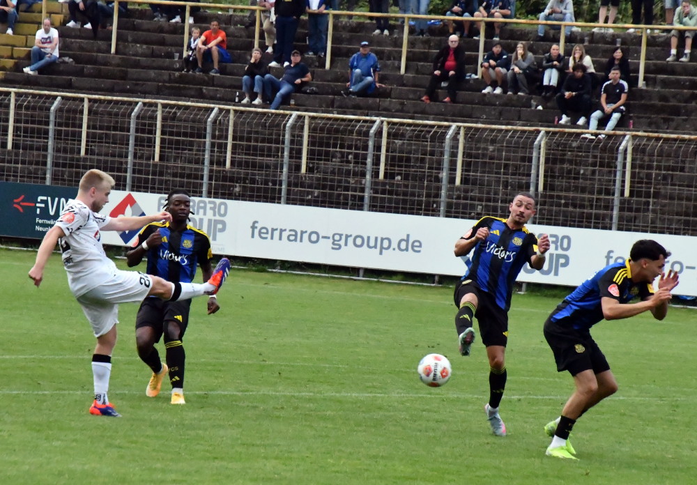 Auch Kristof Scherpfs Schussversuche in der Schlussphase des Hinspiels waren nicht von Erfolg gekrönt: Saarbrücken entführte zum Saisonauftakt mit 2:1 die Punkte aus dem Ellenfeld. (Foto: -jf-)