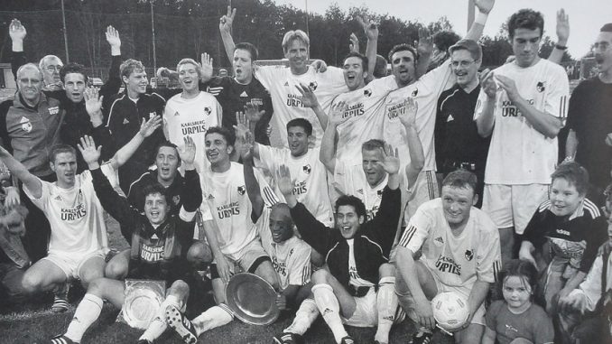 Unser Bild: Das ist die Borussen-Mannschaft, die letztmals den Saarlandpokal ins Ellenfeld holte. 2003 siegten die Borussen vor 4000 Zuschauern in Elversberg mit 1:0 gegen den alten Rivalen FC Homburg und präsentierten sich anschließend stolz mit dem begehrten Pokal. (Foto: Mythos Ellenfeld).